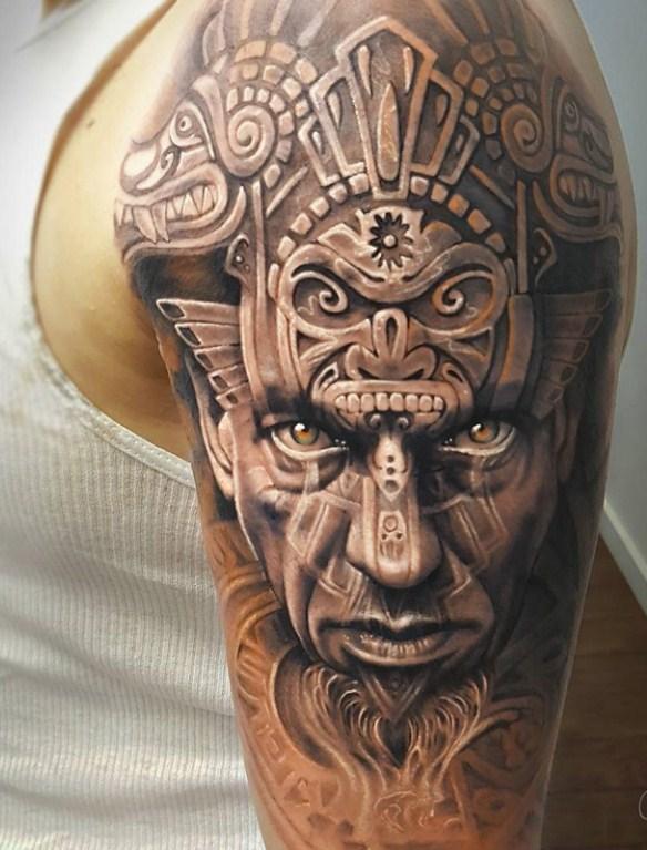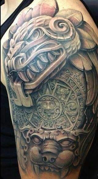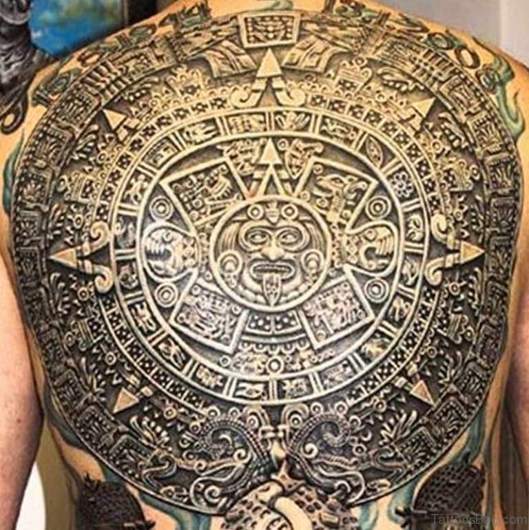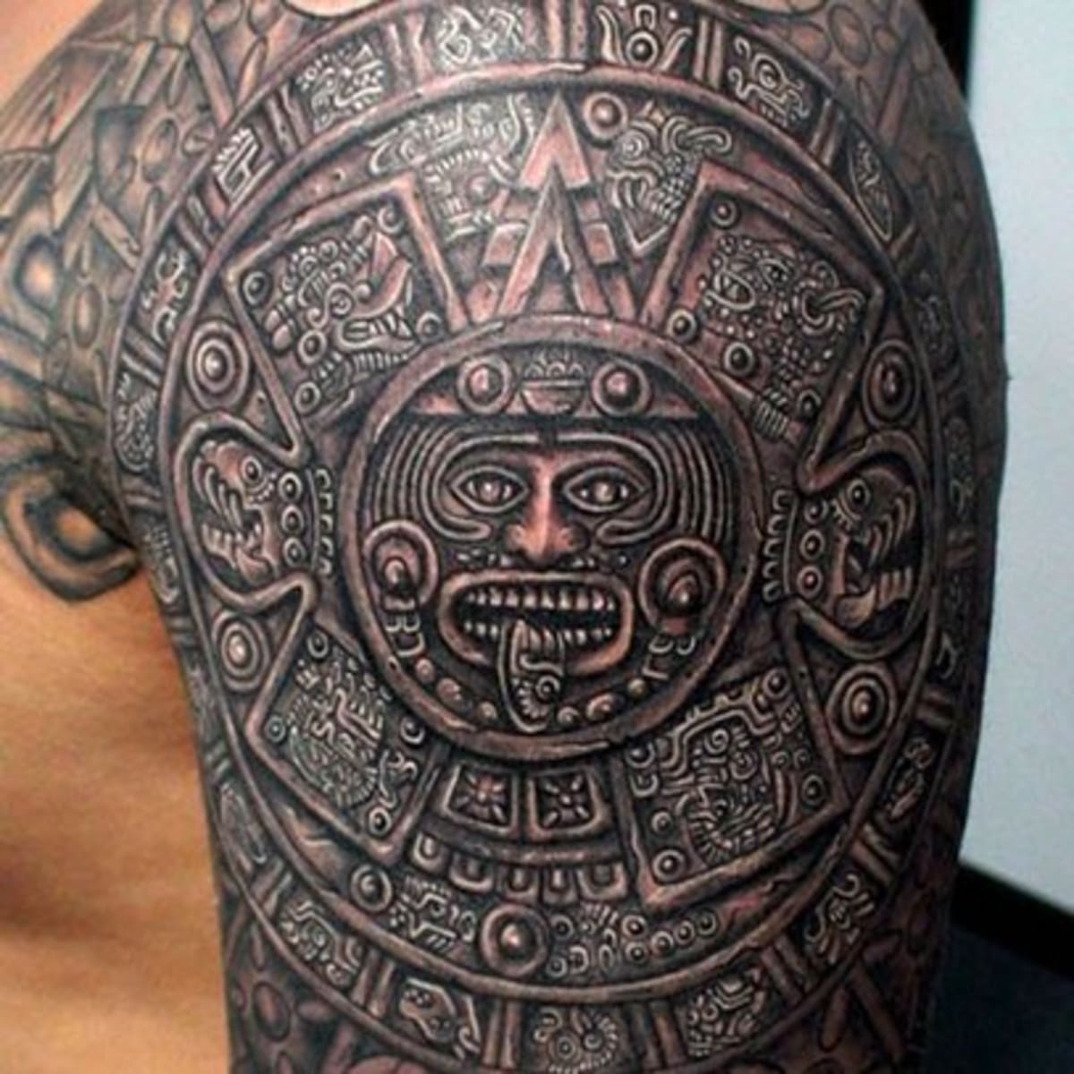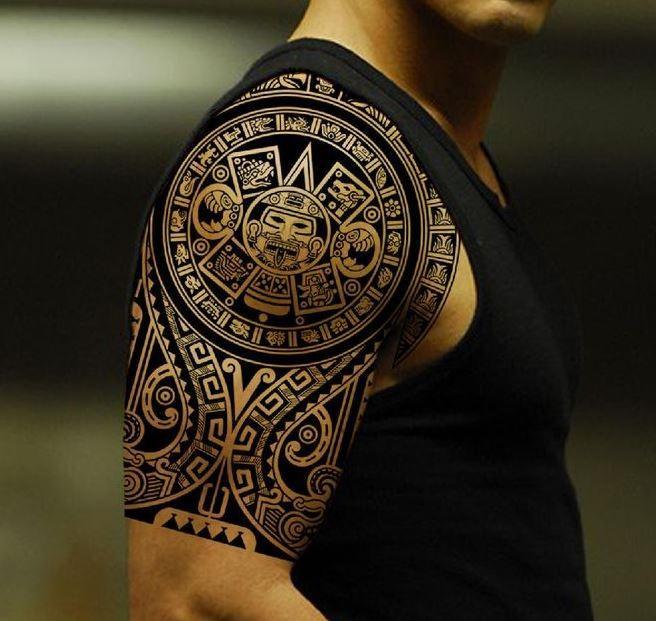 Tatuaż z azteckimi symbolami na ramieniu wygląda stylowo. Również tatuaże z azteckimi symbolami na klatce piersiowej, nodze, czy plecach będą prezentowały się znakomicie.