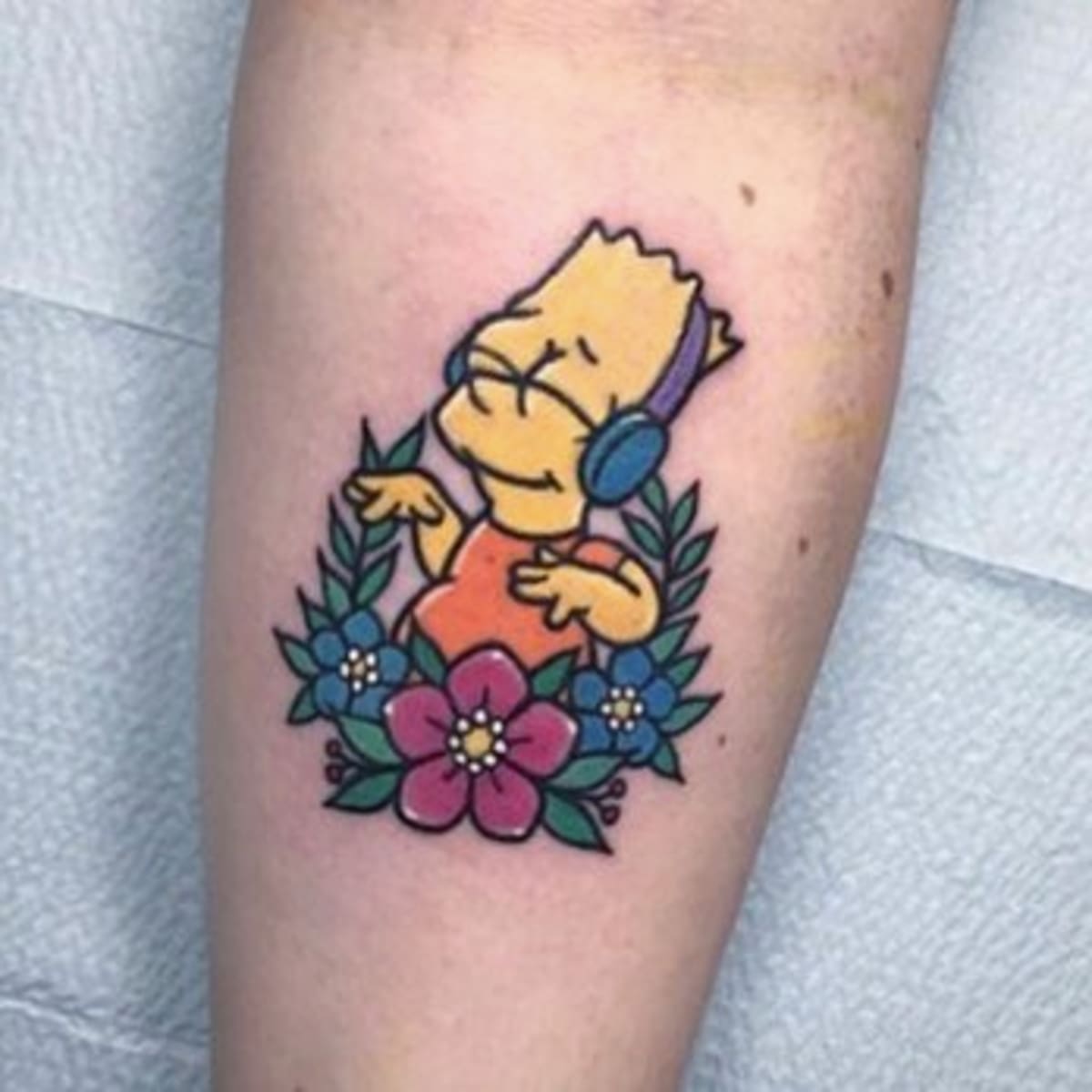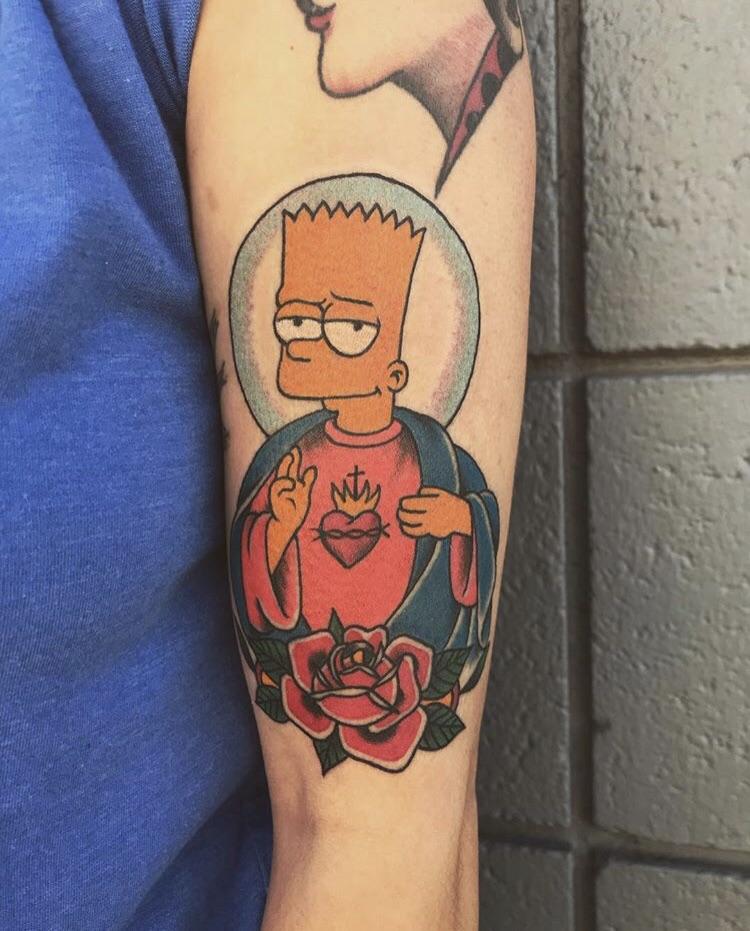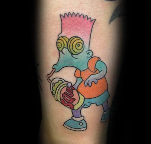 Tatuaż z Bartem Simpsonem na ramieniu wygląda stylowo. Również tatuaże z Bartem Simpsonem na klatce piersiowej, nodze, czy plecach będą prezentowały się znakomicie.