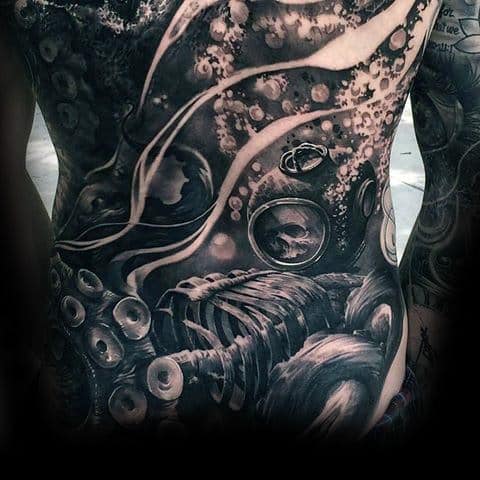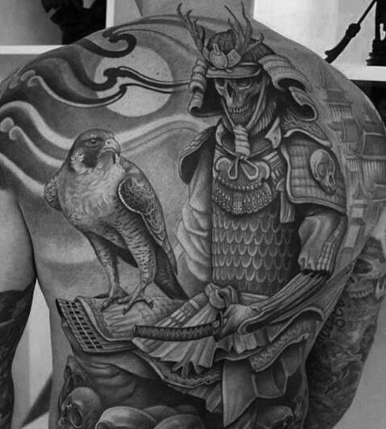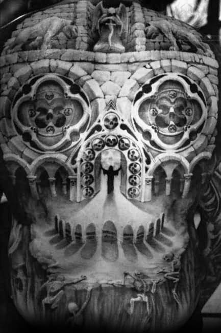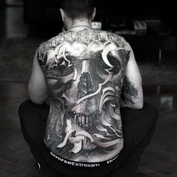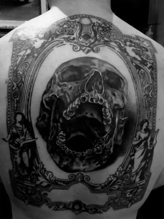 Czaszka lub czaszki na plecach to idealny motyw, aby wyrazić siebie. Pasuje tam zarówno wielobarwny jak i i jednokolorowy tatuaż.