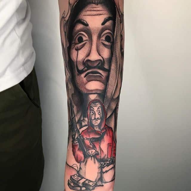 Motyw „Dom z papieru” jest bardzo popularny wśród tatuaży. Taki wzór idealnie będzie wyglądał na przedramieniu. Wystarczy spojrzeć na wiele przykładów.