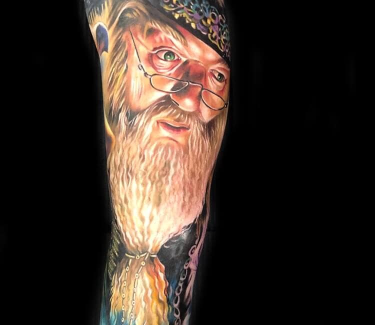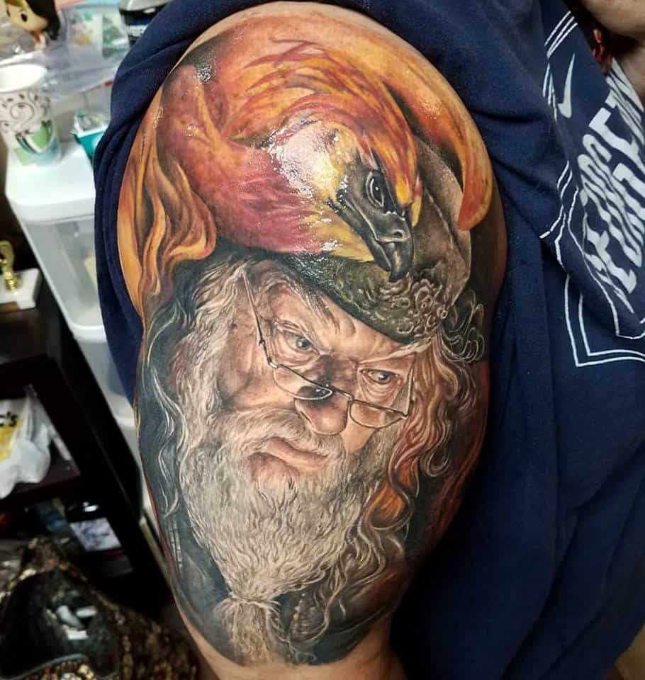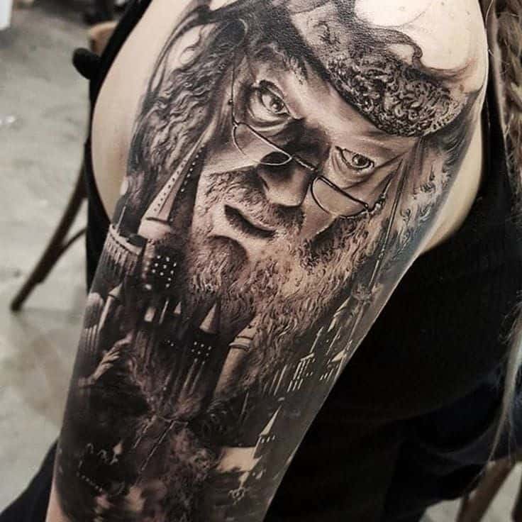 Dumbledore to bardzo popularny wzór tatuażu. Nosi go wiele ludzi i trzeba przyznać, że wyglądają one znakomicie. Zarówno jako kolorowy lub jednokolorowy tatuaż.