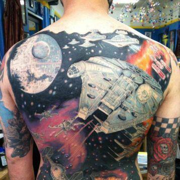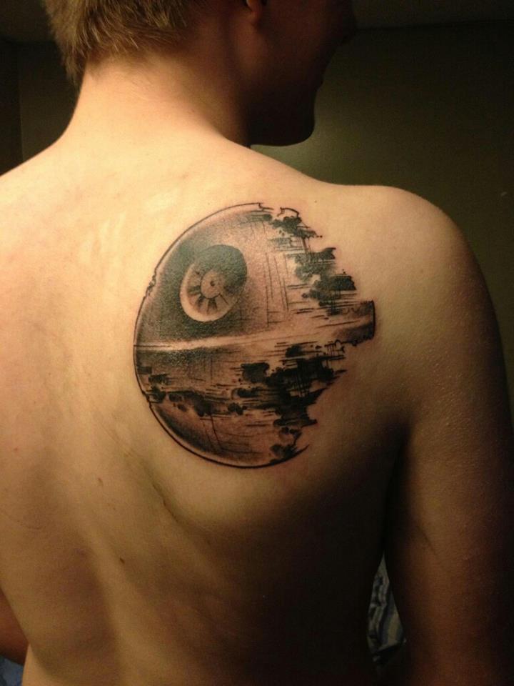 Gwiazda śmierci na plecach to idealny motyw, aby wyrazić siebie. Pasuje tam zarówno wielobarwny jak i i jednokolorowy tatuaż.
