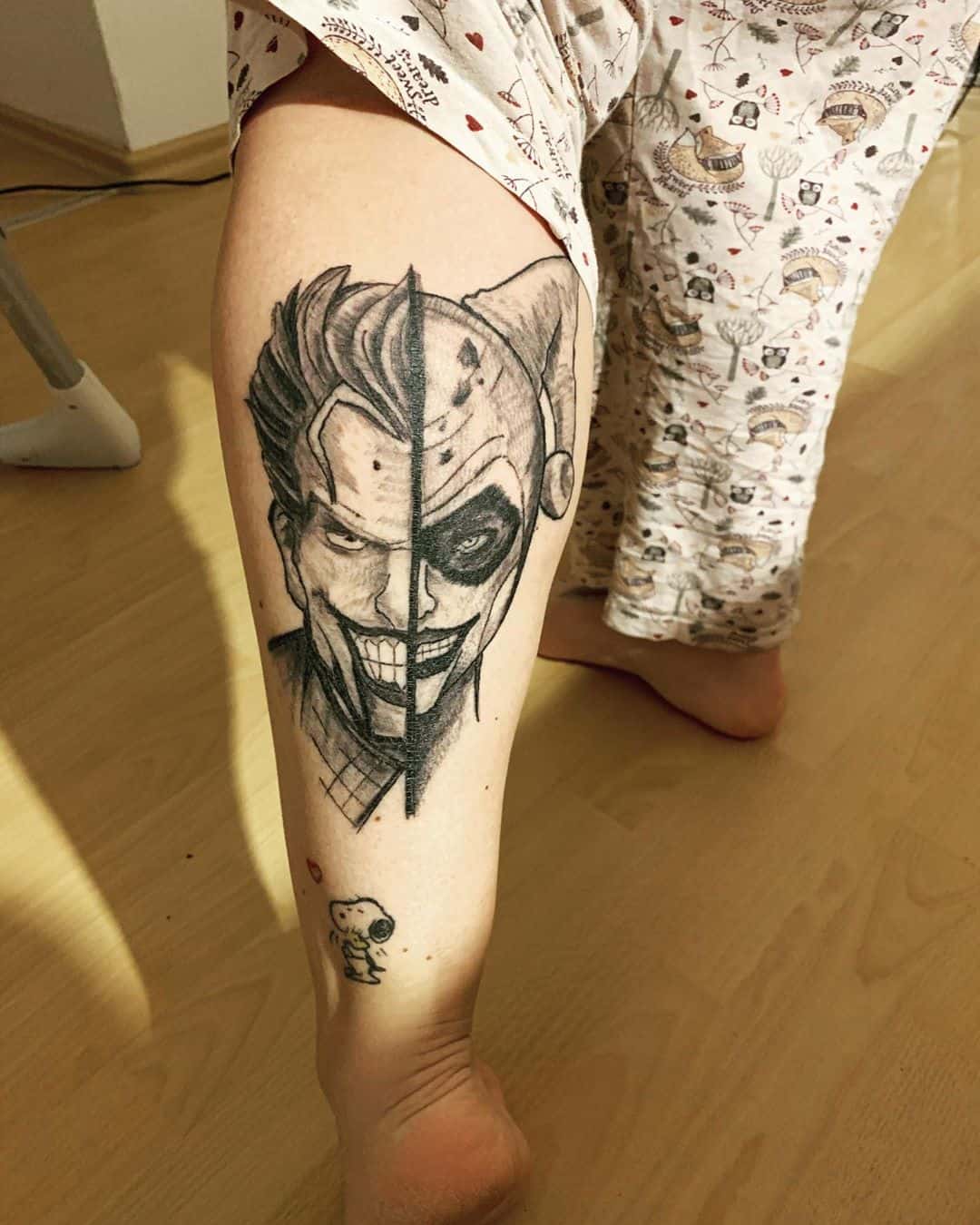 Takie tatuaże nosi wiele osób i możesz się nimi zainspirować. Spójrz na przykłady tatuaży z jokerem na nodze.