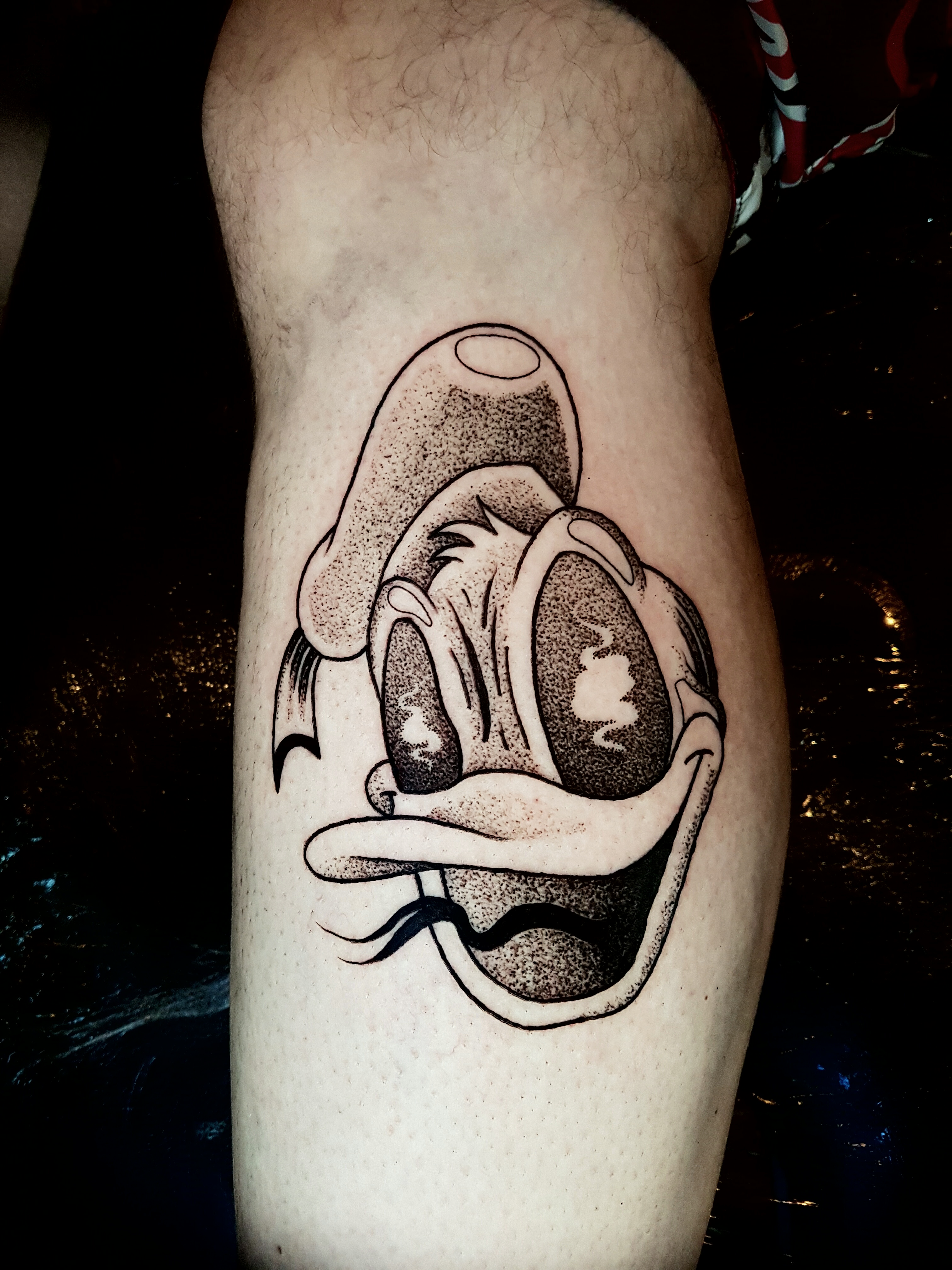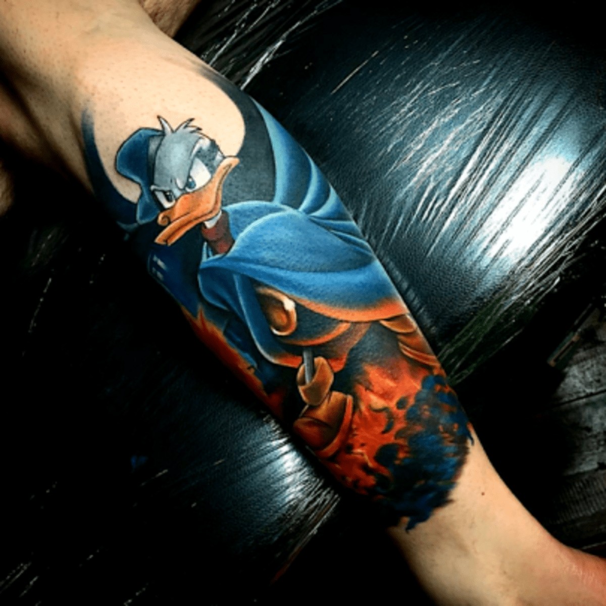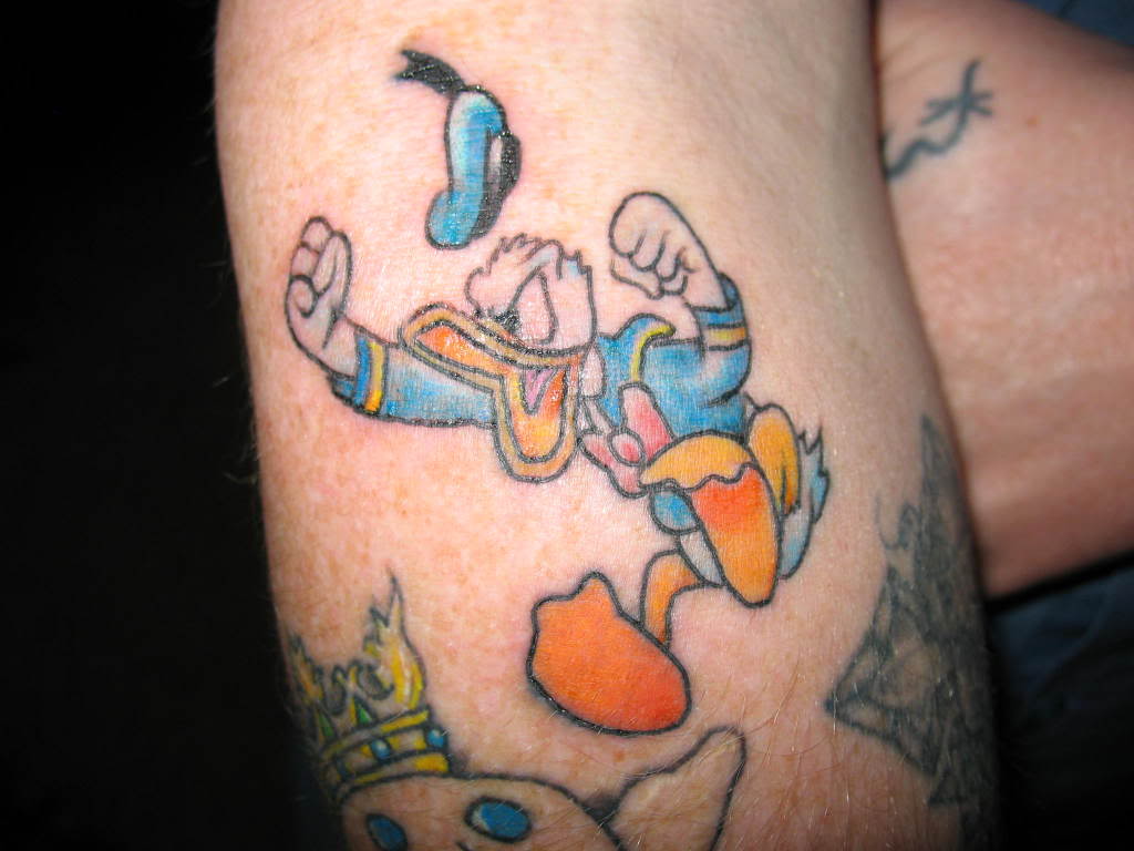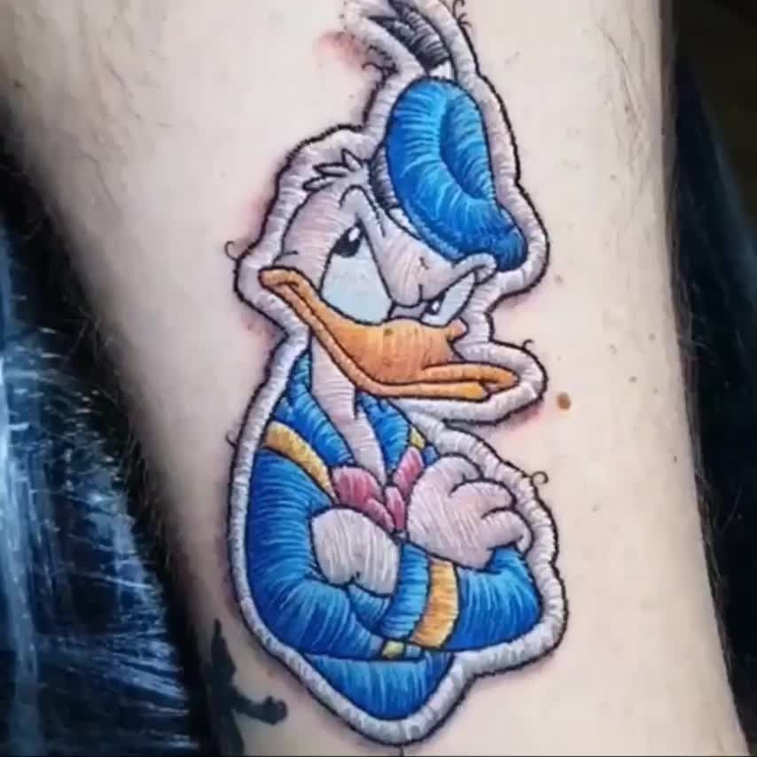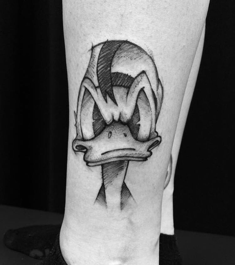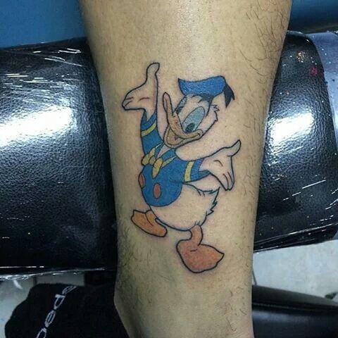 Tatuaż z Kaczorem Donaldem na ramieniu wygląda stylowo. Również tatuaże z Kaczorem Donaldem na klatce piersiowej, nodze, czy plecach będą prezentowały się znakomicie.