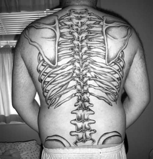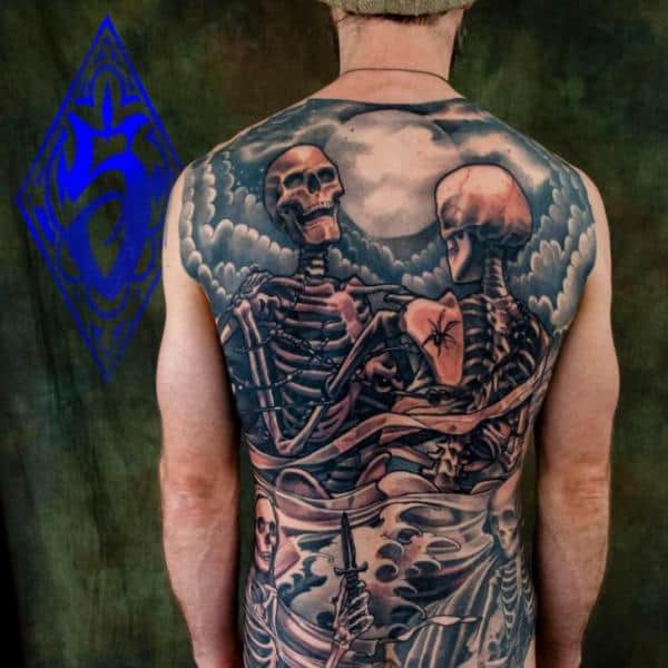 Kościotrup na plecach to idealny motyw, aby wyrazić siebie. Pasuje tam zarówno wielobarwny jak i i jednokolorowy tatuaż.