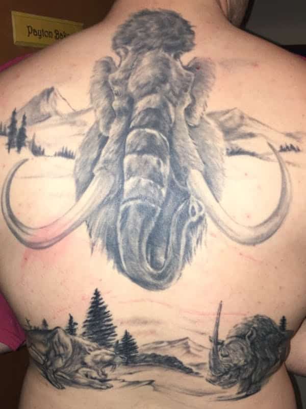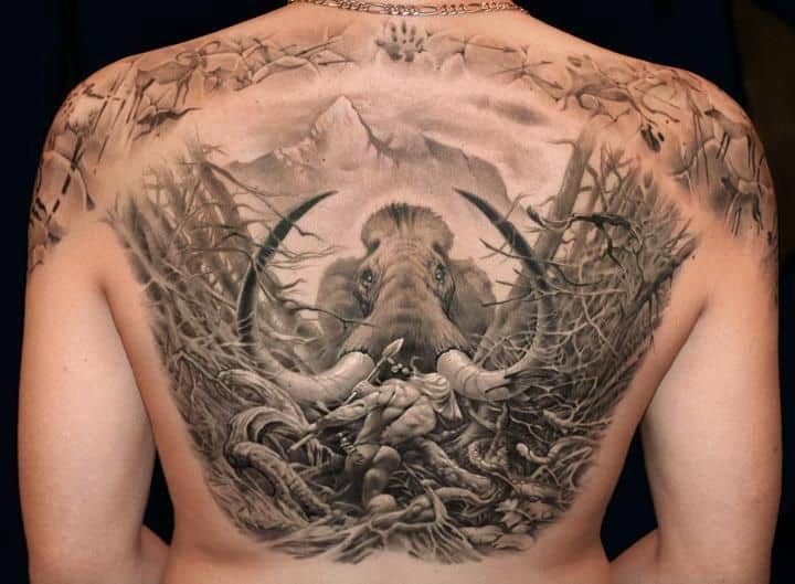 Motyw mamuta jest bardzo popularny wśród tatuaży. Taki wzór idealnie będzie wyglądał na plecach. Wystarczy spojrzeć na wiele przykładów.