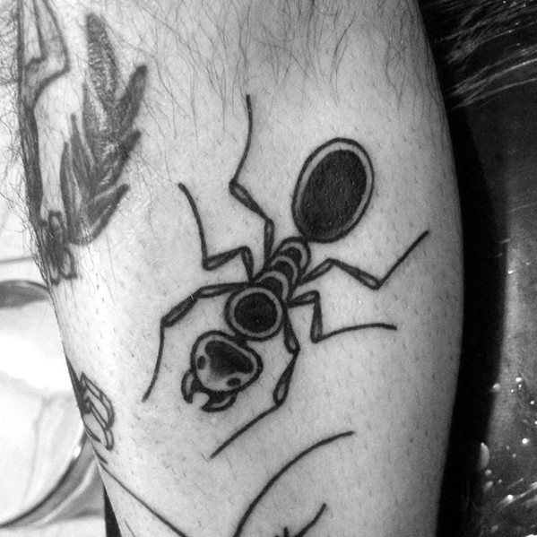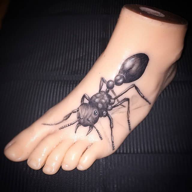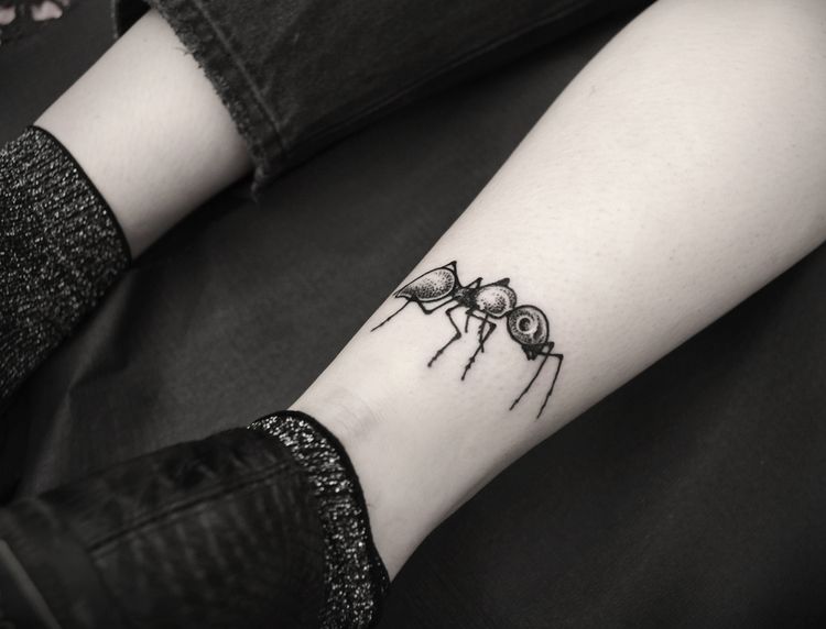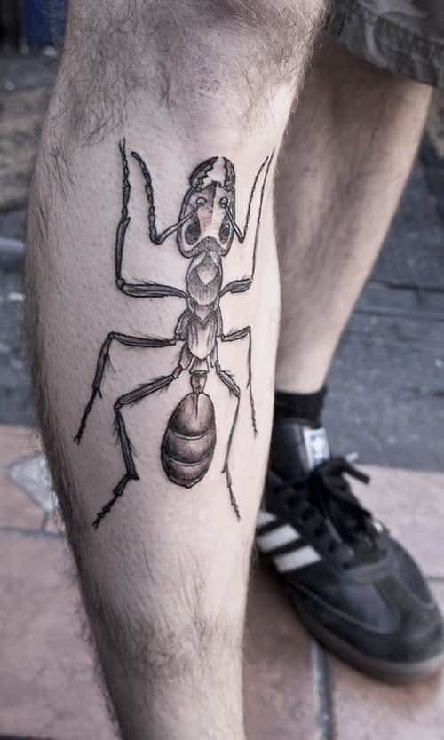 Mrówka na nodze to idealny motyw, aby wyrazić siebie. Pasuje tam zarówno wielobarwny jak i i jednokolorowy tatuaż.