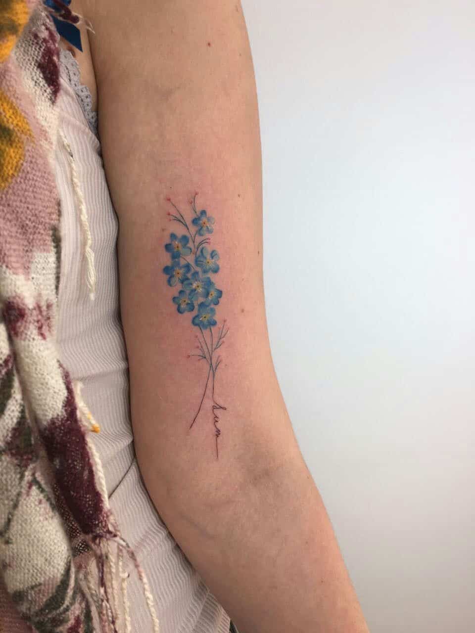 - Tatuaż niezapominajka z napisem – często tatuaż z tym motywem łączy się z imionami bliskich osób lub sentencjami o ważnym dla nas przesłaniu. Dodanie tekstu sprawia, że tatuaż staje się jeszcze bardziej osobisty.