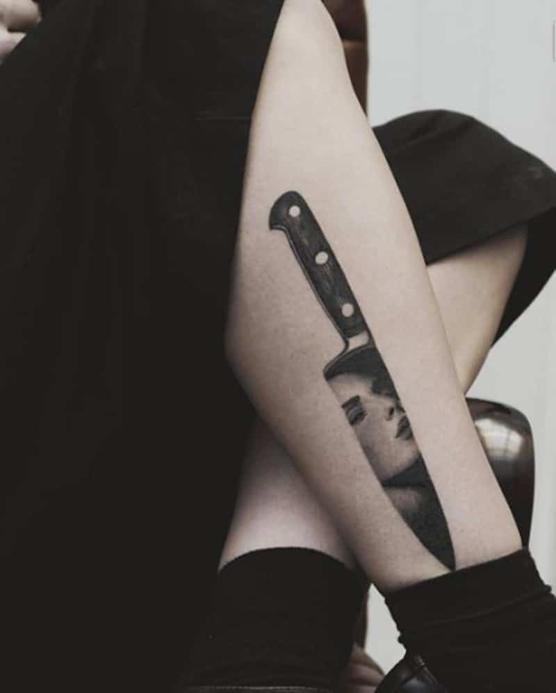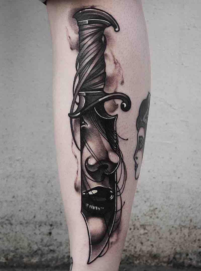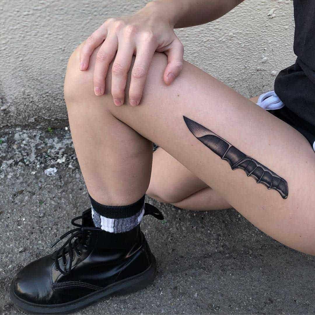 Takie tatuaże nosi wiele osób i możesz się nimi zainspirować. Spójrz na przykłady tatuaży z nożem na nodze.