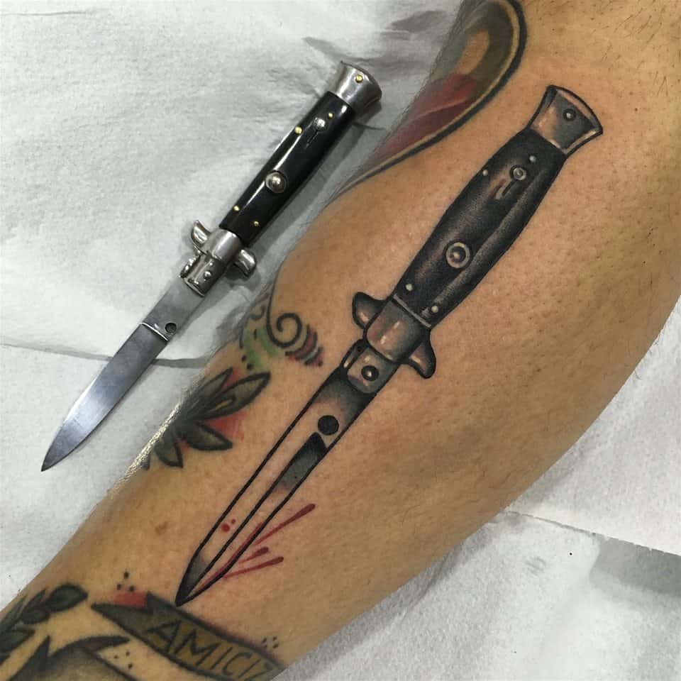 Nóż na nodze to idealny motyw, aby wyrazić siebie. Pasuje tam zarówno wielobarwny jak i i jednokolorowy tatuaż.