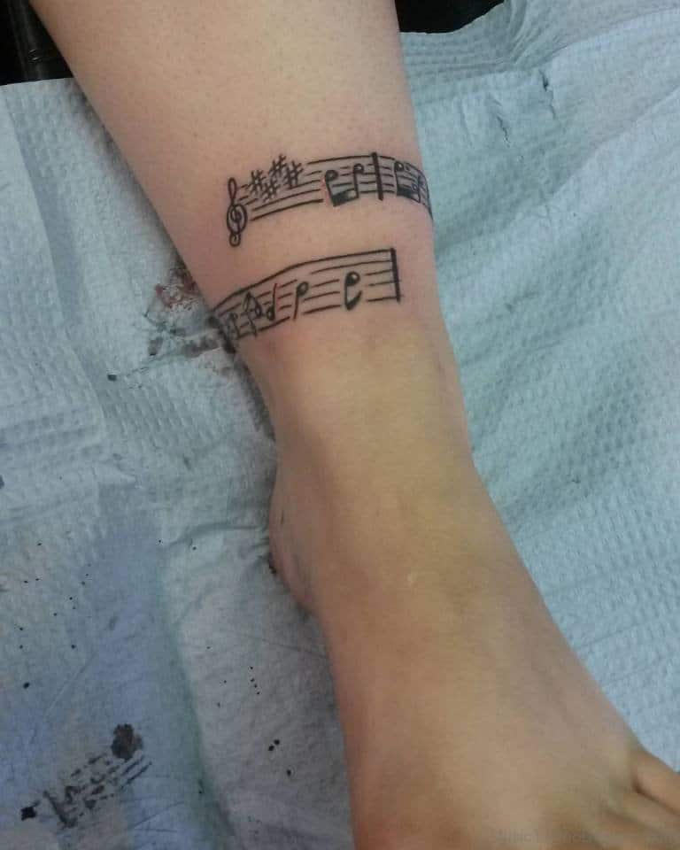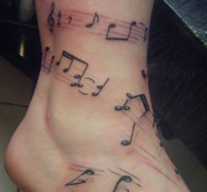 Takie tatuaże nosi wiele osób i możesz się nimi zainspirować. Spójrz na przykłady tatuaży z nutkami na nodze.