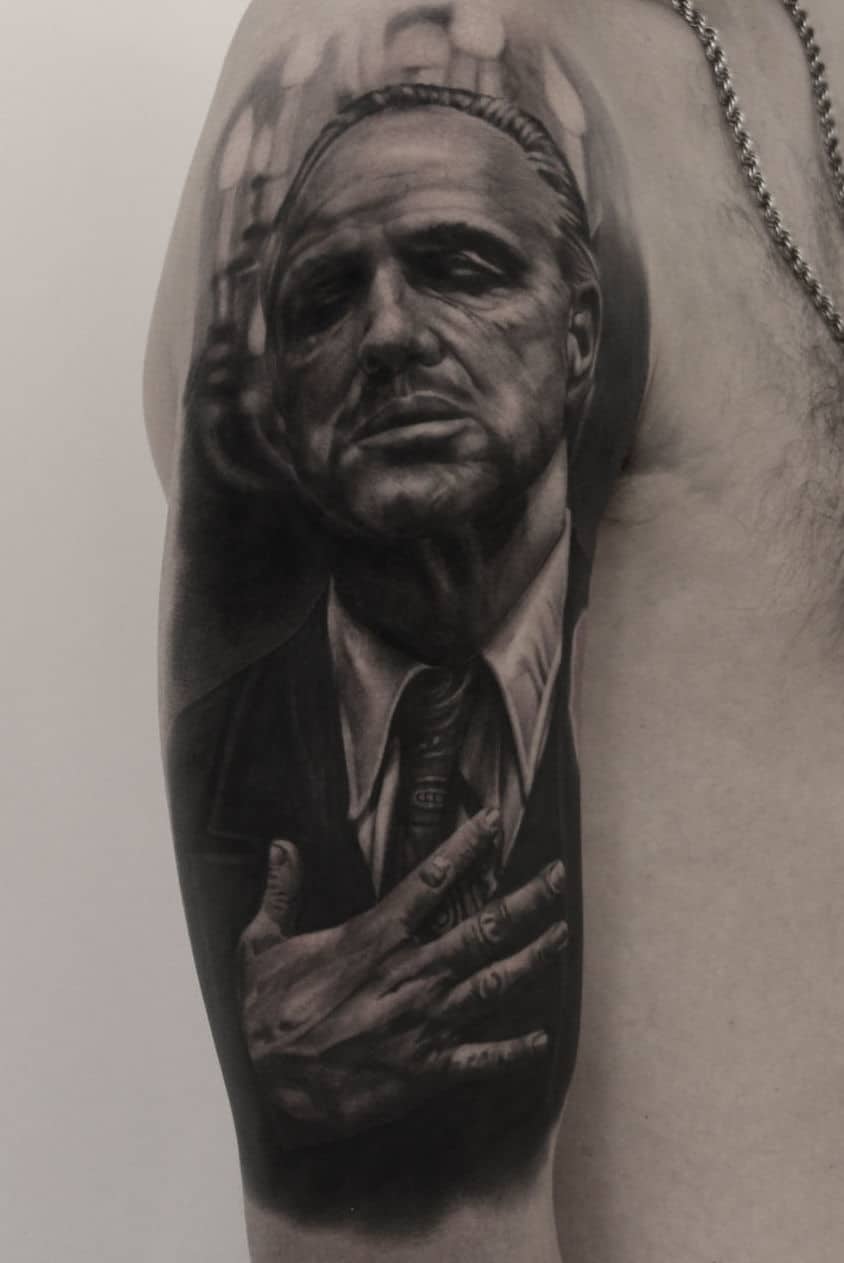 Motyw Ojca Chrzestnego jest bardzo popularny wśród tatuaży. Taki wzór idealnie będzie wyglądał na ramieniu. Wystarczy spojrzeć na wiele przykładów.