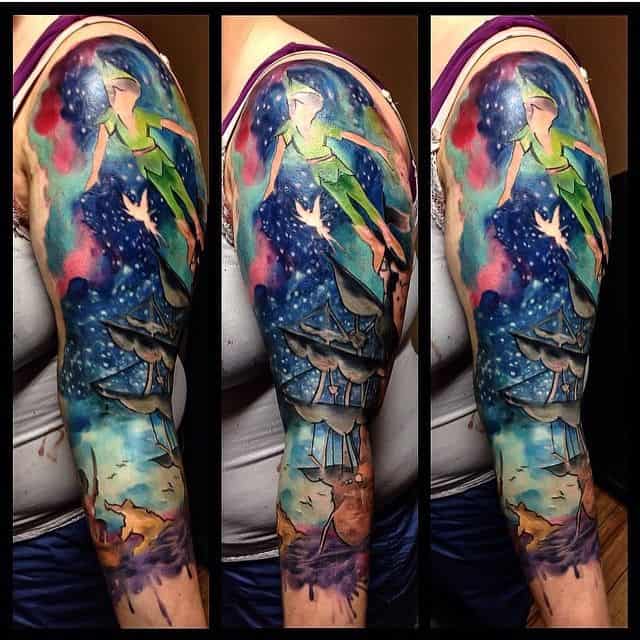 Motyw Piotrusia Pana jest bardzo popularny wśród tatuaży. Taki wzór idealnie będzie wyglądał na ramieniu. Wystarczy spojrzeć na wiele przykładów.