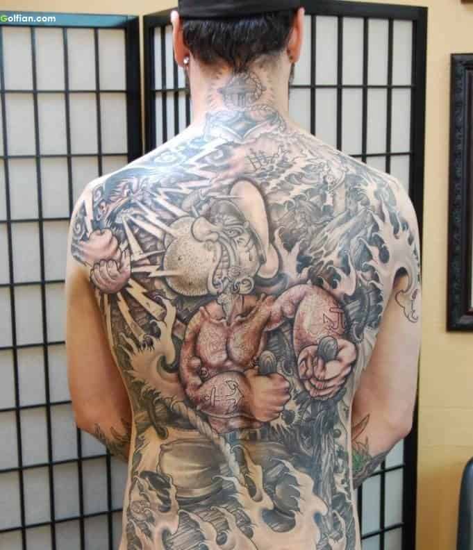 Popeye na plecach to idealny motyw, aby wyrazić siebie. Pasuje tam zarówno wielobarwny jak i i jednokolorowy tatuaż.