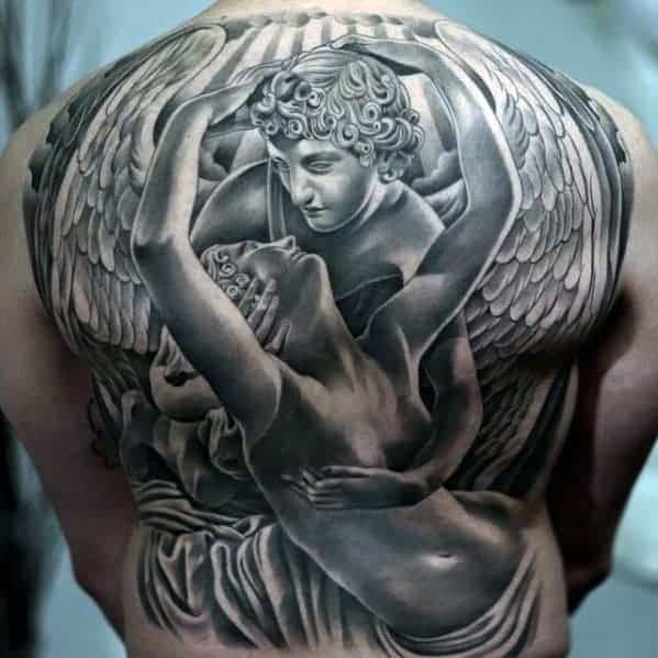 Posąg anioła to jeden z najpopularniejszych i najmodniejszych wzorów tatuażu. Motyw z posągiem anioła doskonale wygląda na różnych częściach ciała.