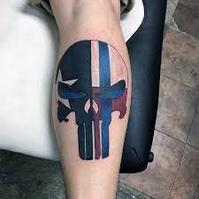 Takie tatuaże nosi wiele osób i możesz się nimi zainspirować. Spójrz na przykłady tatuaży z Punisherem na nodze.