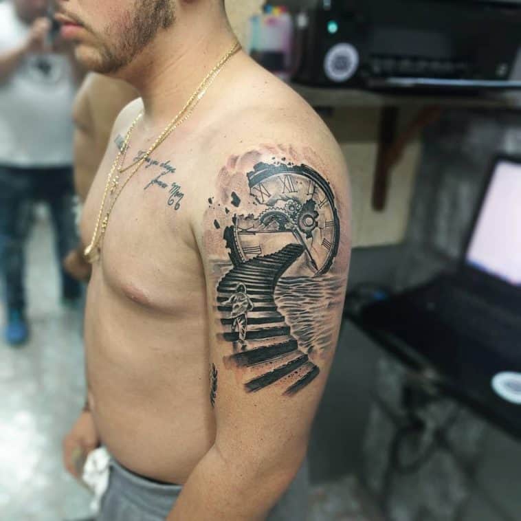 Schody to jeden z najpopularniejszych i najmodniejszych wzorów tatuażu. Motyw ze schodami doskonale wygląda na różnych częściach ciała.