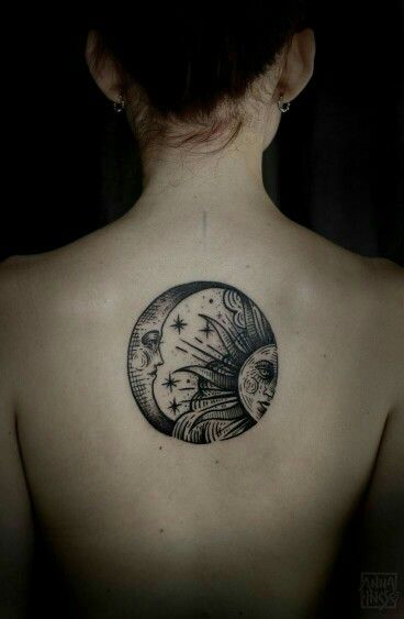 Słońce i księżyc na plecach to idealny motyw, aby wyrazić siebie. Pasuje tam zarówno wielobarwny jak i i jednokolorowy tatuaż.