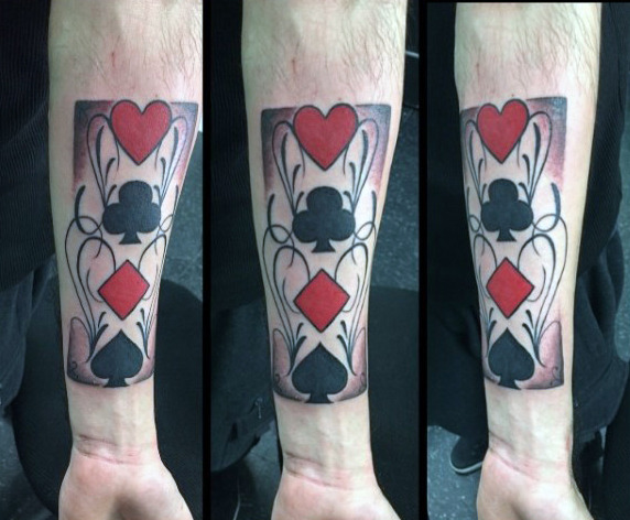 Tatuaż z symbolami kart będzie prezentował się dobrze na plecach, na klatce piersiowej, czy też nogach lub rękach. Motyw kart idealnie pasuje zarówno do tatuażu jednokolorowego jak i wielobarwnego. Wszystko zależy od naszego pomysłu, wizji i podpowiedzi tatuatora.