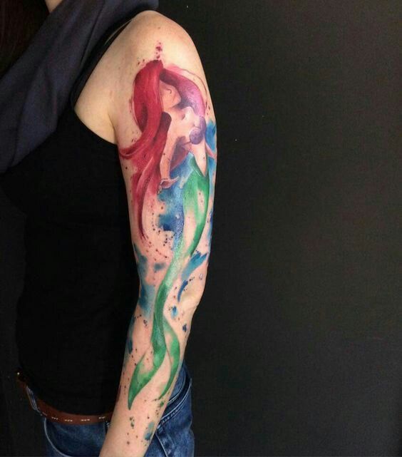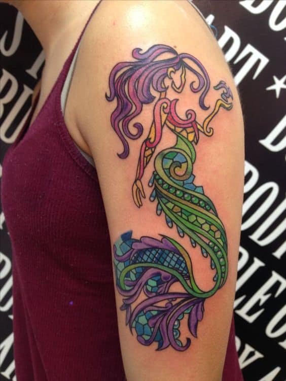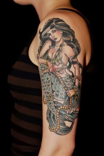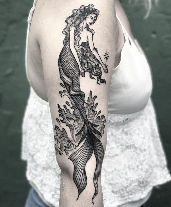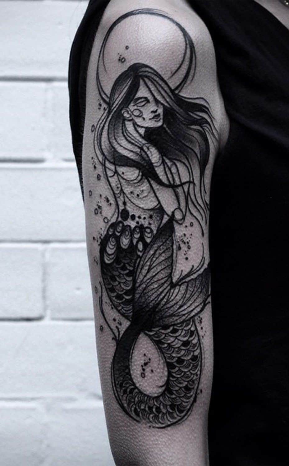 Motyw syreny jest bardzo popularny wśród tatuaży. Taki wzór idealnie będzie wyglądał na ramieniu. Wystarczy spojrzeć na wiele przykładów.