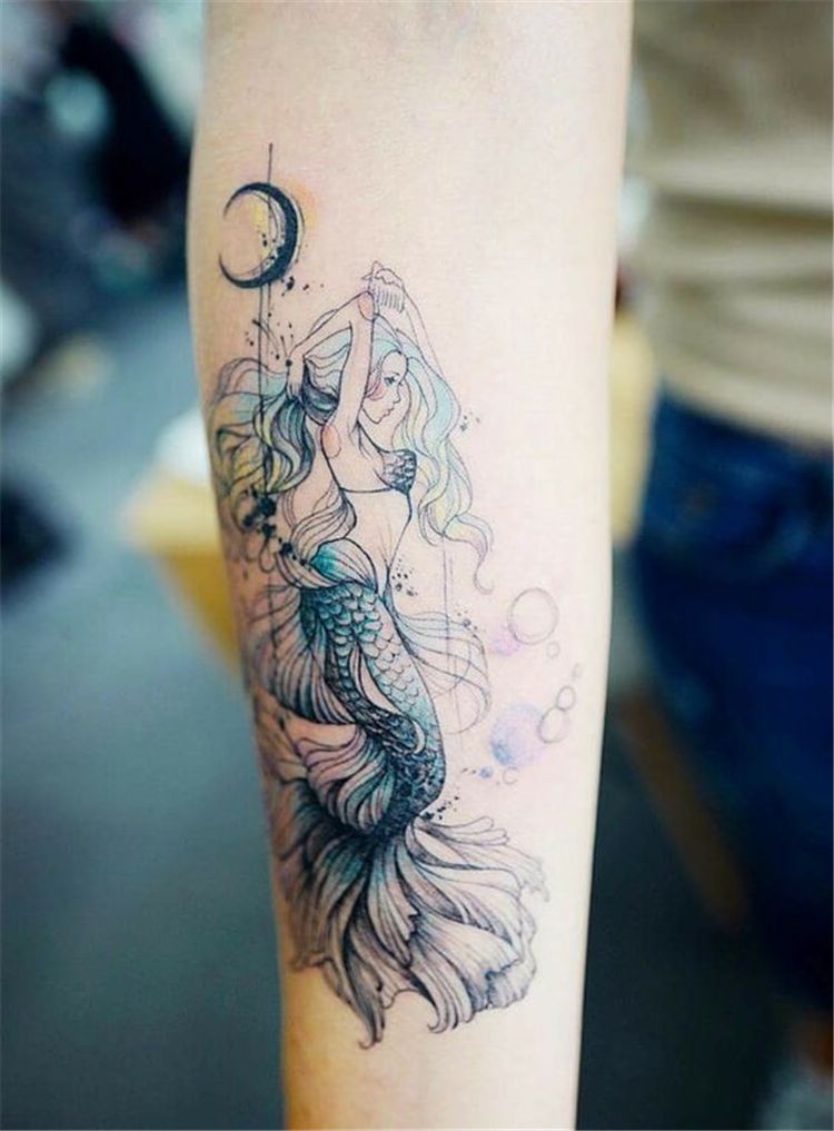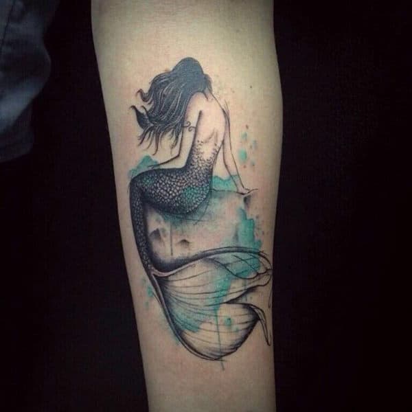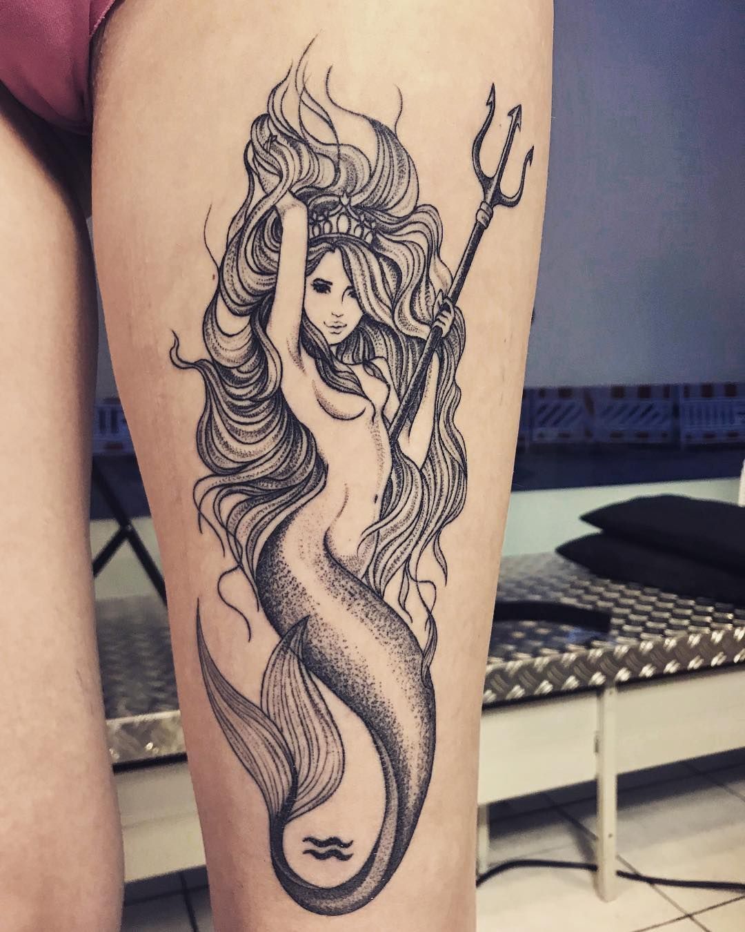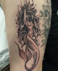 Tatuaż z syreną na ramieniu wygląda stylowo. Również tatuaże z syreną na klatce piersiowej, nodze, czy plecach będą prezentowały się znakomicie.