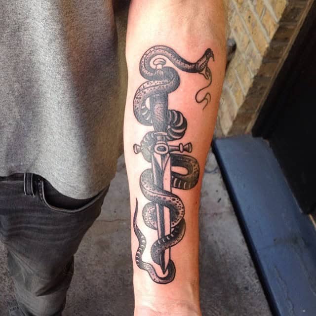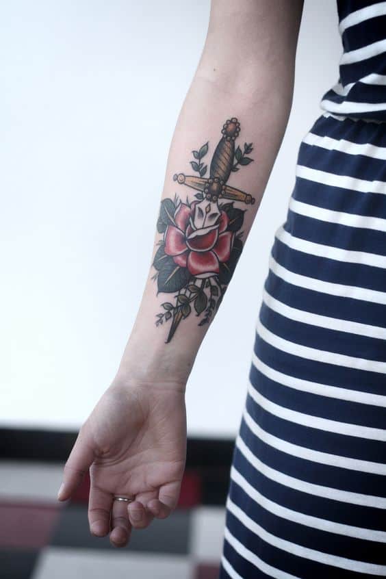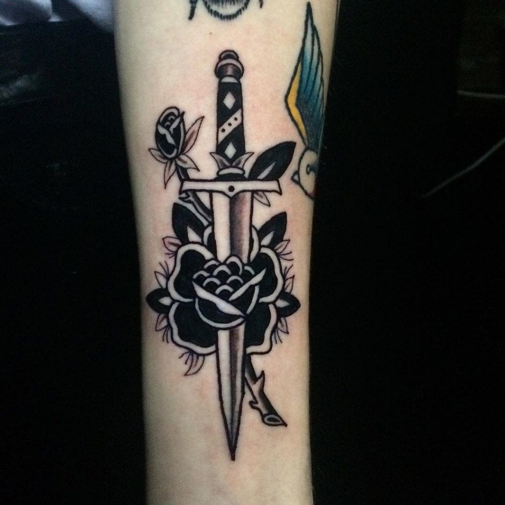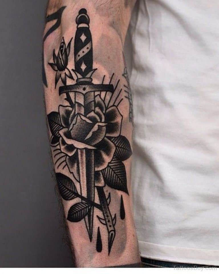 Motyw sztyletu jest bardzo popularny wśród tatuaży. Taki wzór idealnie będzie wyglądał na przedramieniu. Wystarczy spojrzeć na wiele przykładów.