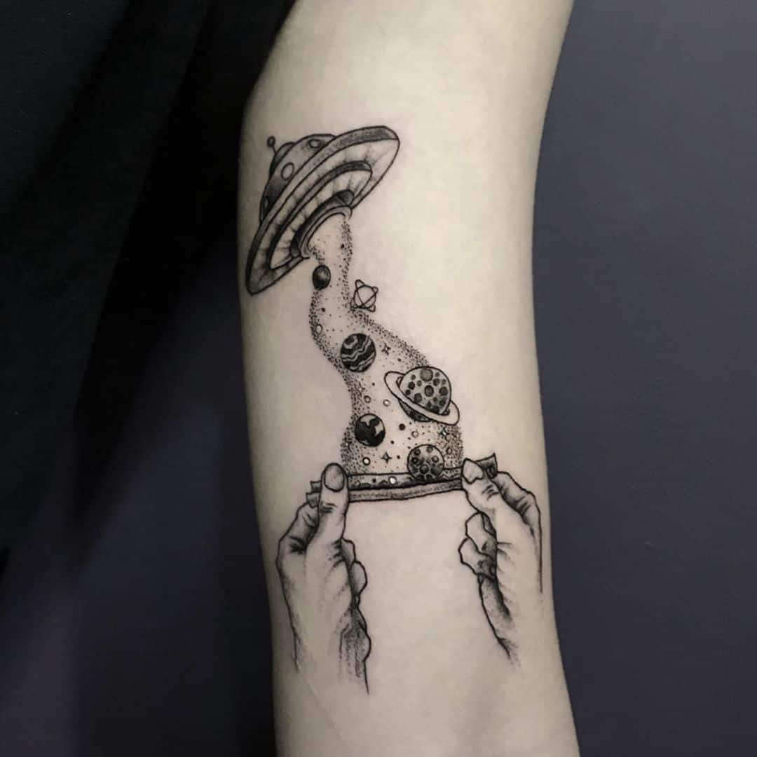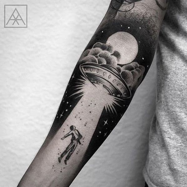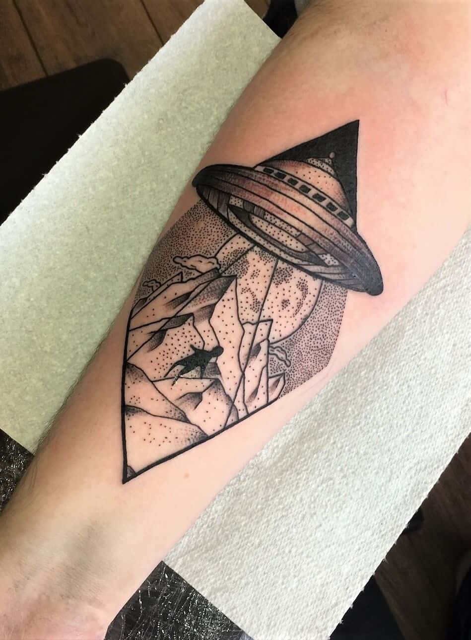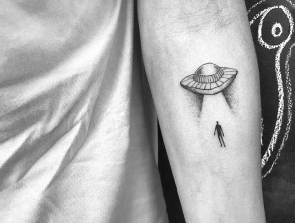 Motyw UFO jest bardzo popularny wśród tatuaży. Taki wzór idealnie będzie wyglądał na przedramieniu. Wystarczy spojrzeć na wiele przykładów.