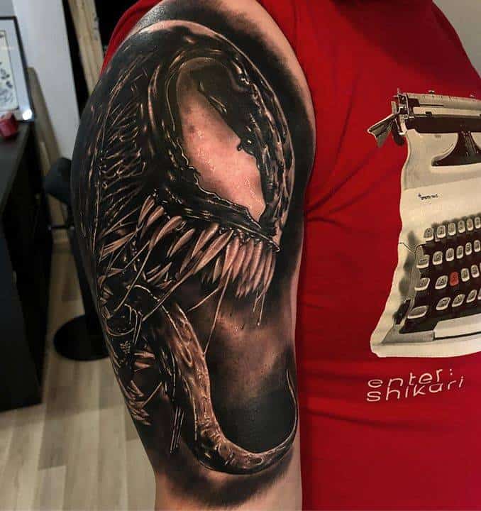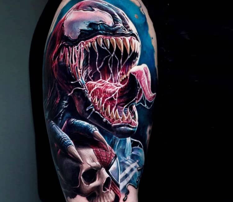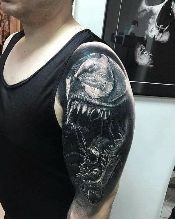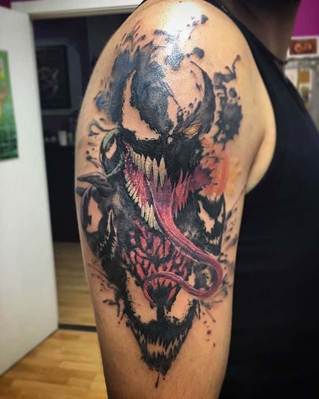 Motyw Venoma jest bardzo popularny wśród tatuaży. Taki wzór idealnie będzie wyglądał na ramieniu. Wystarczy spojrzeć na wiele przykładów.