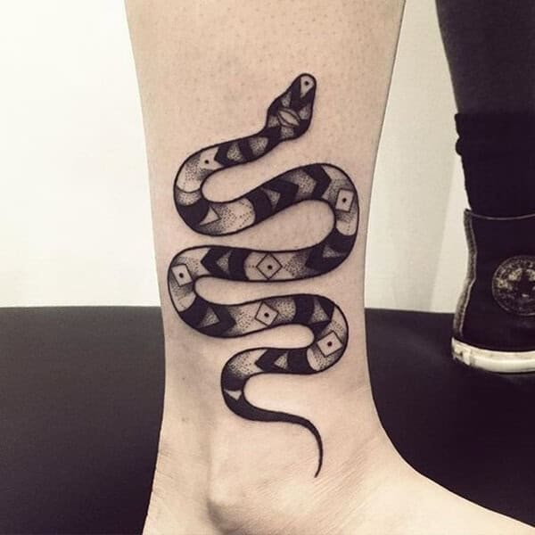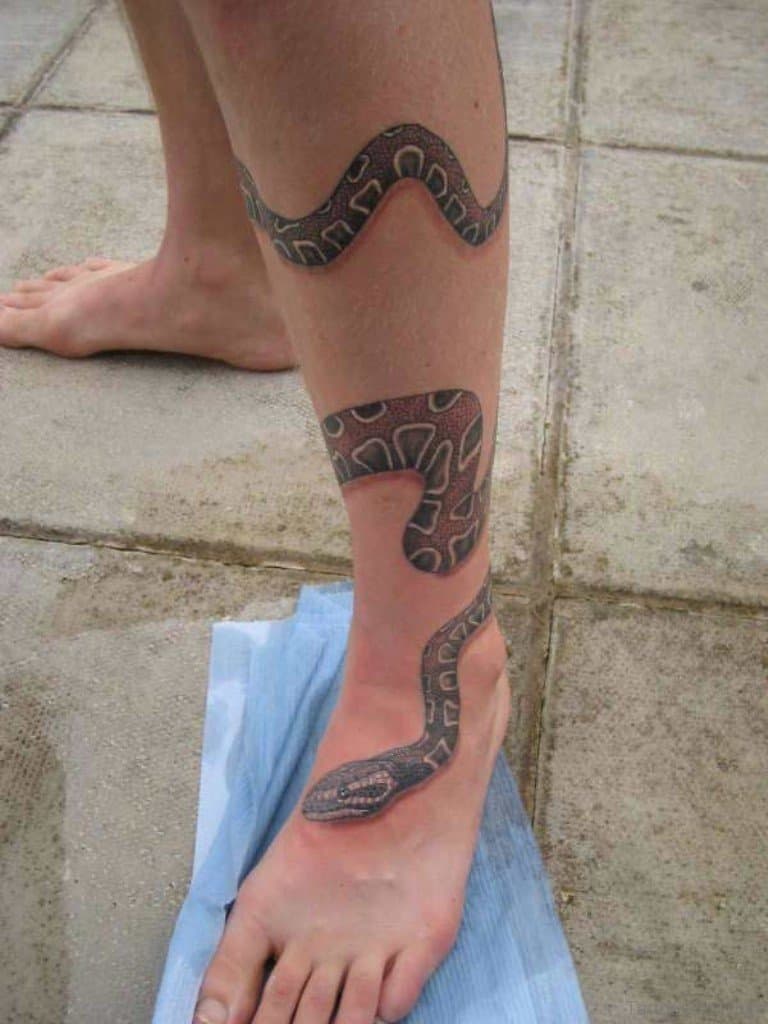 Wąż na nodze to idealny motyw, aby wyrazić siebie. Pasuje tam zarówno wielobarwny jak i i jednokolorowy tatuaż.