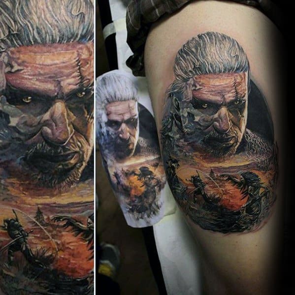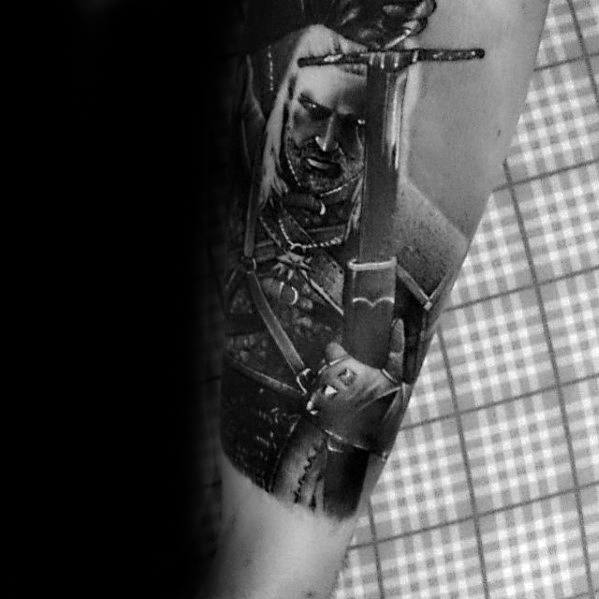 Tatuaż z Wiedźminem na ramieniu wygląda stylowo. Również tatuaże z Wiedźminem na klatce piersiowej, nodze, czy plecach będą prezentowały się znakomicie.