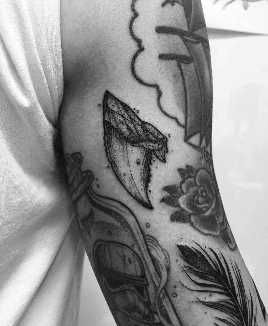 Motyw zęba rekina jest bardzo popularny wśród tatuaży. Taki wzór idealnie będzie wyglądał na ramieniu. Wystarczy spojrzeć na wiele przykładów.